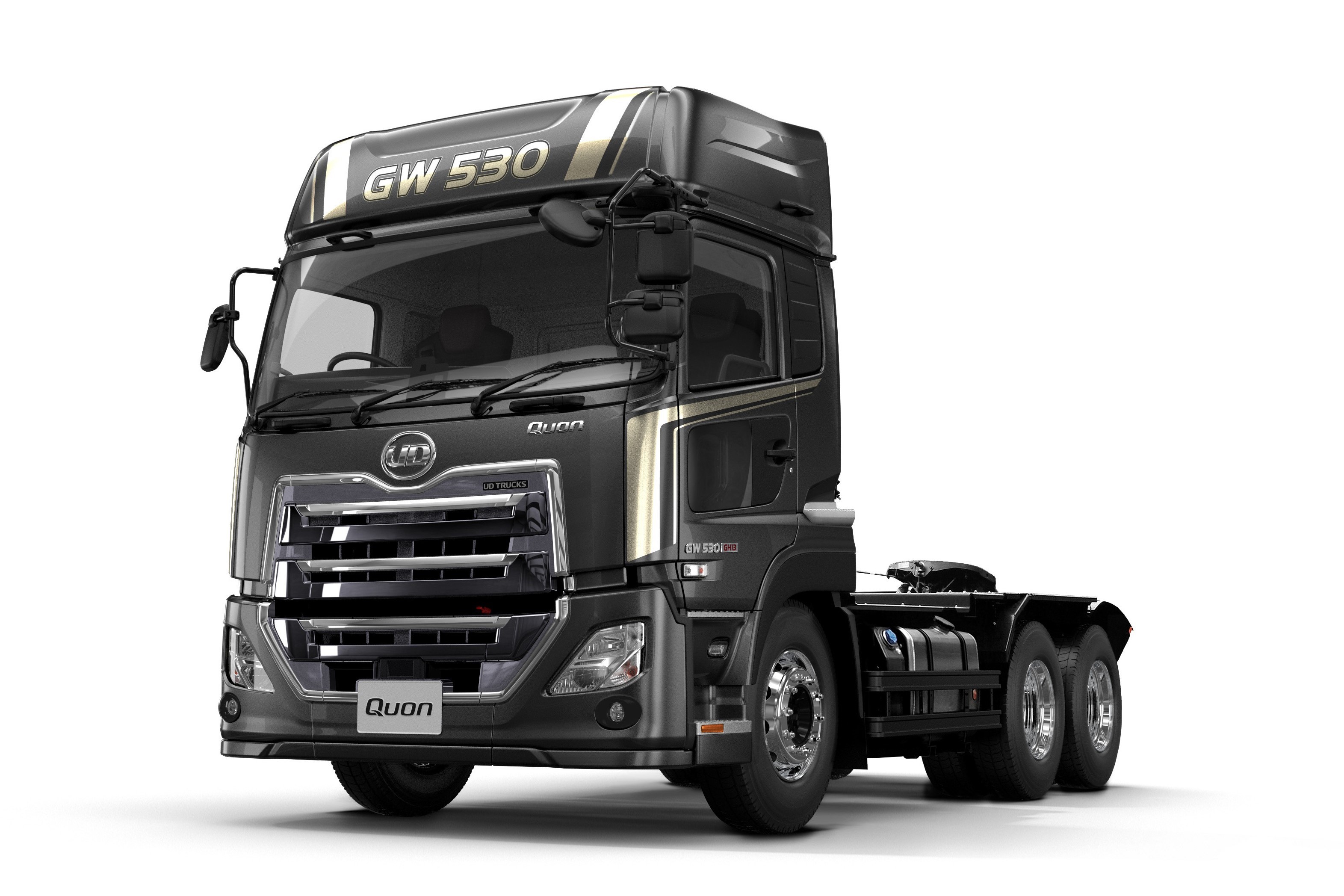 This heavy-duty tractor is designed to put  people and cargo first. This exhibit is part of the UD Trucks 90th Anniversary Commemorative Package.