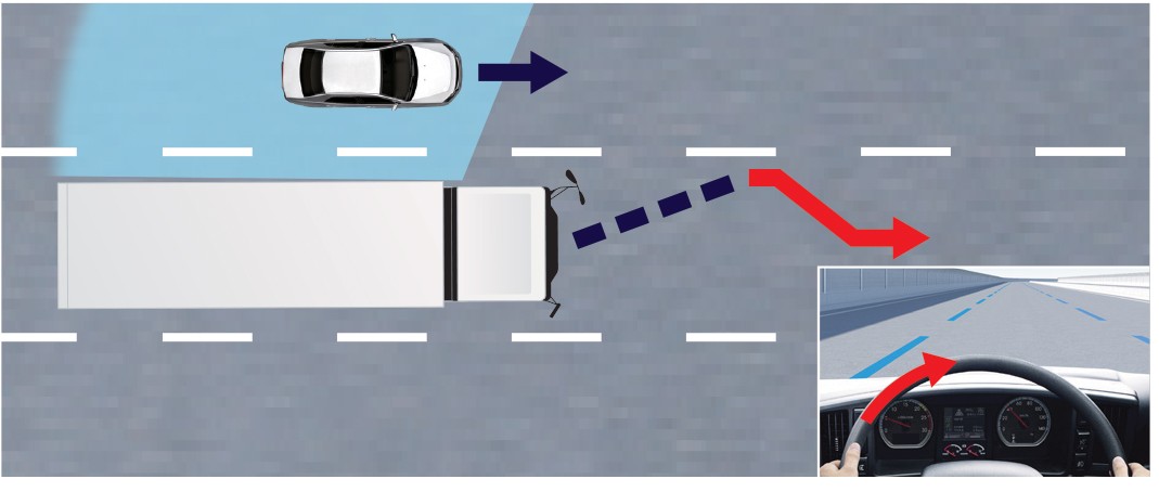車線変更時、ブラインドスポットモニター用のレーダーで、隣接レーンを走行する車両を検知し、衝突の危険性が高まった場合には、レーンキープアシストが作動し、車線内側に車両を戻すことで、車線変更を抑止します。