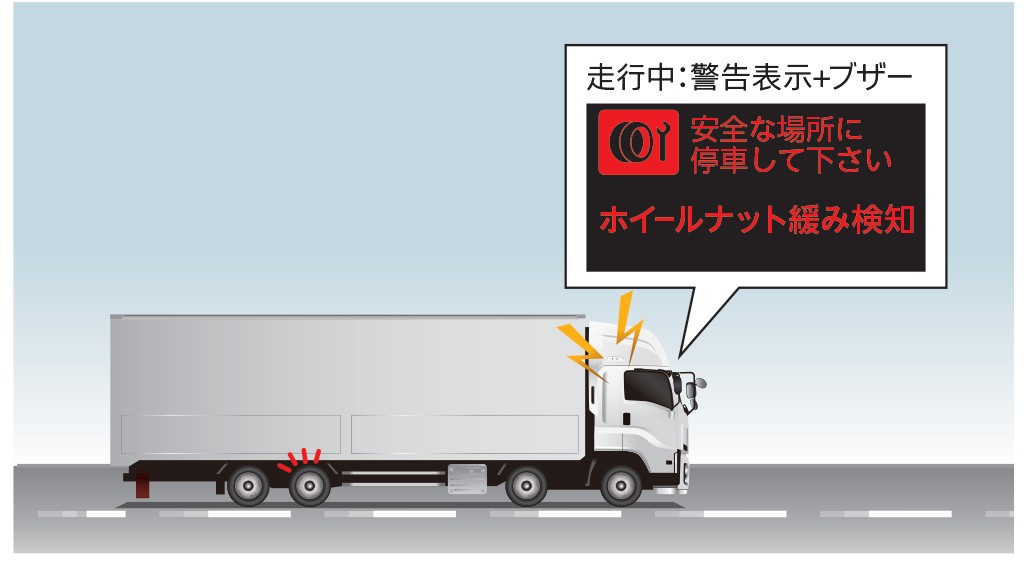 車輪速センサーの装着により、ホイールナットの緩みが発生した時の異常を検知し、車輪脱落の予兆の段階で警告表示とブザーでドライバーへ注意喚起を行います。