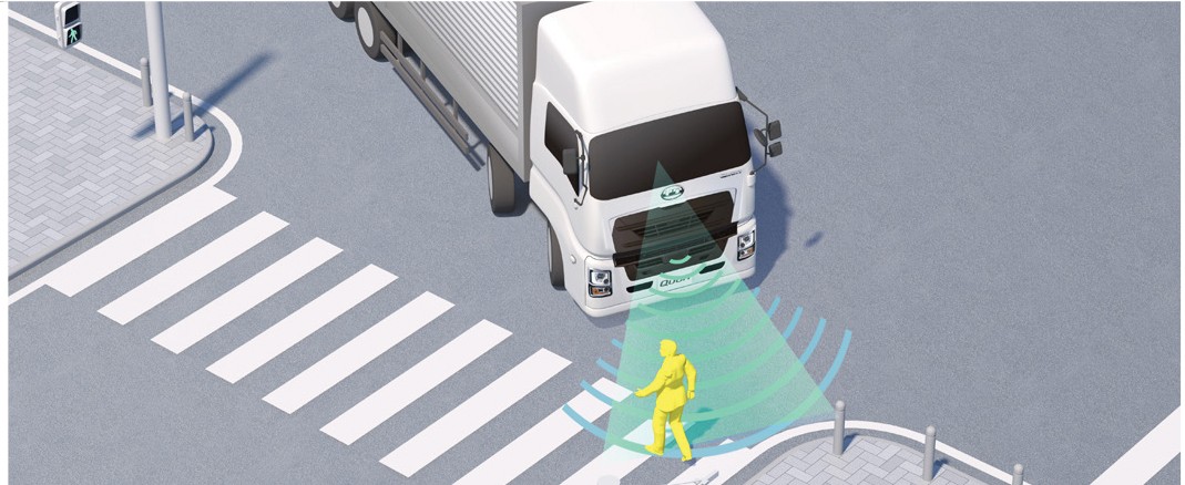近距離レーダーを車両前方および左右に備え、すぐれた検知性能を確保。歩行者や自転車などと衝突するおそれがある場合、左右ピラー部の警告灯、メーターディスプレイ、警報音で注意喚起を行ないます。発進時や交差点での右左折時、出会い頭、車線変更時などの事故抑制に効果を発揮します。
