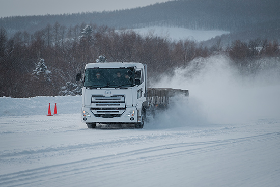 We consistently conduct a variety of tests under extreme conditions in cold regions. For example, to verify the new Quon’s stability on frozen roads, we repeatedly tested the disc brakes and UDSC (stability control), as well as “one-shot starting.” We also tested Quon’s “escapability” on snow-packed roads and muddy areas.